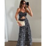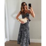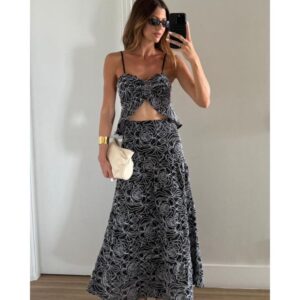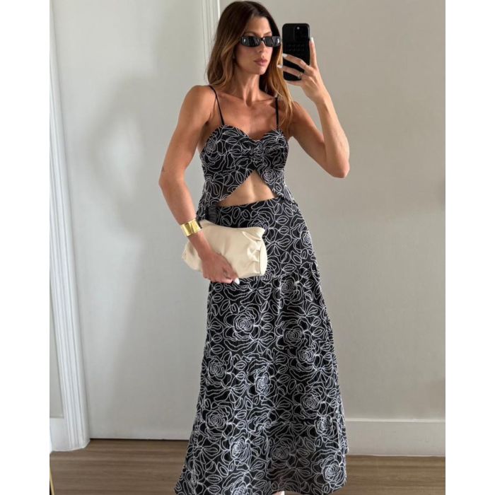 Conjunto saia longa levemente ampla, forrada e com fechamento traseiro em zíper invisível, acompanhado de top de alças finas reguláveis, decote arredondado e fechamento posterior por botões.